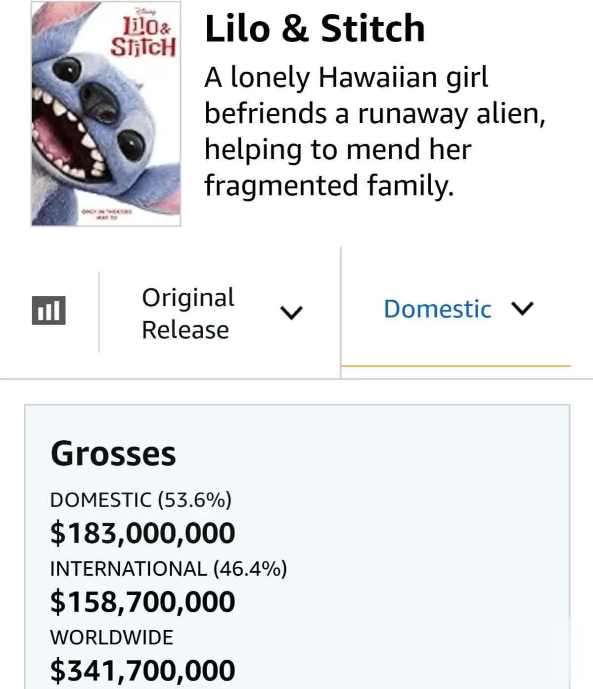 继《我的宇宙大电影》之后,北好意思影市迎来了本年的第二个爆款。迪士尼的真东说念主改编新作《星际宝贝史迪奇》首映后,首周四天在北好意思原土阛阓大卖1.83亿好意思元,在国外阛阓收票房1.587亿好意思元,众人票房3.417亿好意思元。