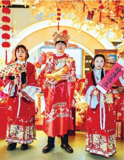 4日晚6时,“长江荣耀”游轮静静地泊岸在长江岸边。在登船口,身着大红色古装的责任主说念主员浅笑着管待搭客。“我一上船就感受到浓浓的年味。”来自汉口的市民李大姨带着孙子登船,看到两副长长的对子挂在汽船大厅上方,红红的“福”字被摆在楼梯旁,朱红色的拱形门框与大红灯笼相映生辉,组成一个充满当代感与传统韵味的节日场景。搭客纷繁列队,等着在这个年味满满的场景中拍照。孩子则跑到傍边的市场摊位,玩起剪纸等非遗手作。