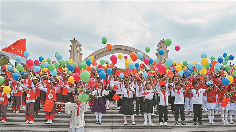 9时许,在小提琴的摇荡乐声中,来自哈尔滨新区的2000余名师生、家长,手捏五彩气球、艾草花束等,同现场的市民、旅客在太阳石广场上皆声演唱歌曲《太阳岛上》、《我和我的故国》。跟着启动庆典的认真运转,千余个五彩气球伴跟着掌声与欢跃声,慢慢升起、随风遨游,在阳光的照射下,广场上变得五彩斑斓。