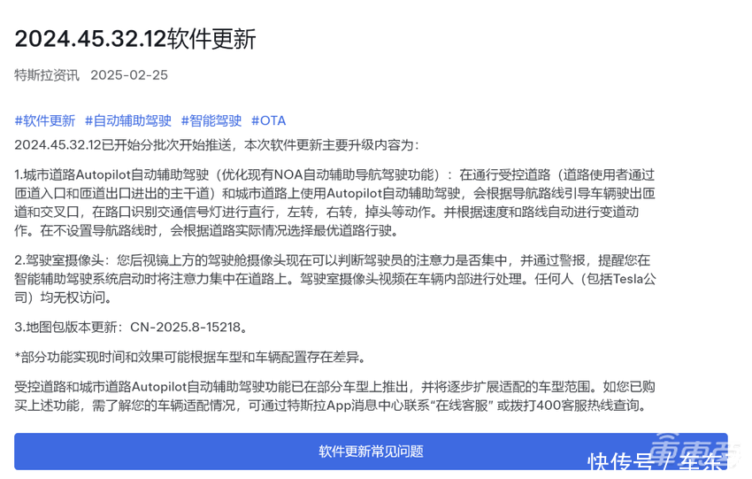 车东西2月25日音问,特斯拉官方小依次发布了“2024.45.32.12软件更新”资讯,其中提到了“城市说念路Autopilot自动缓助驾驶(优化现存NOA自动缓助导航驾驶功能)”。