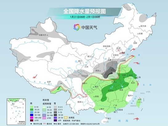 中央兴隆台预测,1月30日至2月2日,青藏高原东部、西北地区东南部、华北南部、黄淮、江汉西部等地有小到中雪或雨夹雪,其中,陕西南部、河南西部、湖北西部及西藏东部等地的部分地区有大雪,局地暴雪;南边大部有小到中雨,局地大雨。