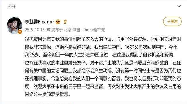 李凯馨本东说念主也转发了这份声明,还高出走心肠修起了一波:“很对不起因为我的事情闹这样大,占用了宇宙资源。听到那些灌音的时代,我几乎顾虑到原地爆炸!这足够不是我说的话!我生在中国,16岁又回到这里,咫尺26岁了,东说念主生一半的时分皆在中国家过。在这里,我获得了好多契机和匡助,能在我方心爱的行状里闪闪发光。关于这片地盘,我是发自内心的怜爱和感恩,在职何波及中国的态度问题上,我皆毫不会迂缓!”