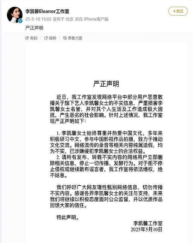 5月10日下昼,李凯馨责任室火速发布了一份“严正声明”,这声明可不是闹着玩的,平直否定三连:灌音本色熟习合手造!皆是假的!外传了!责任室要提起法律的火器维权了!
