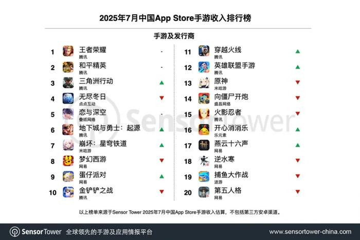 SensorTower称,米哈游《崩铁》迎来全新3.4版块“因为太阳将要损伤”,跟着限度5星变装“白厄”“Saber”和“Archer”的登场,游戏在7月2日至3日挽回登顶大家手游畅销榜,7月收入暴涨325%,创2025年以来新高,带动米哈游本期收入劲增28%,稳居刊行商收入榜第4名。