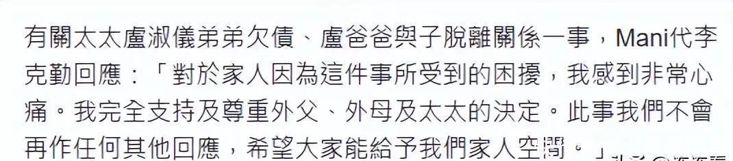 11月12日,李克勤岳父卢国辉对外发布声明,明确默示从2025年11月12日起,与犬子卢煜培贯注断绝父子关系。