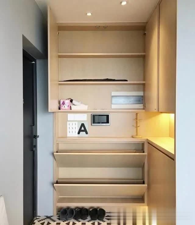 ▲另一种是定制遮挡法,许多户型强弱电在鞋柜或其他收纳柜位置,这时可用定制柜笼罩遮挡,背板开孔,完整笼罩且不影响正常使用。