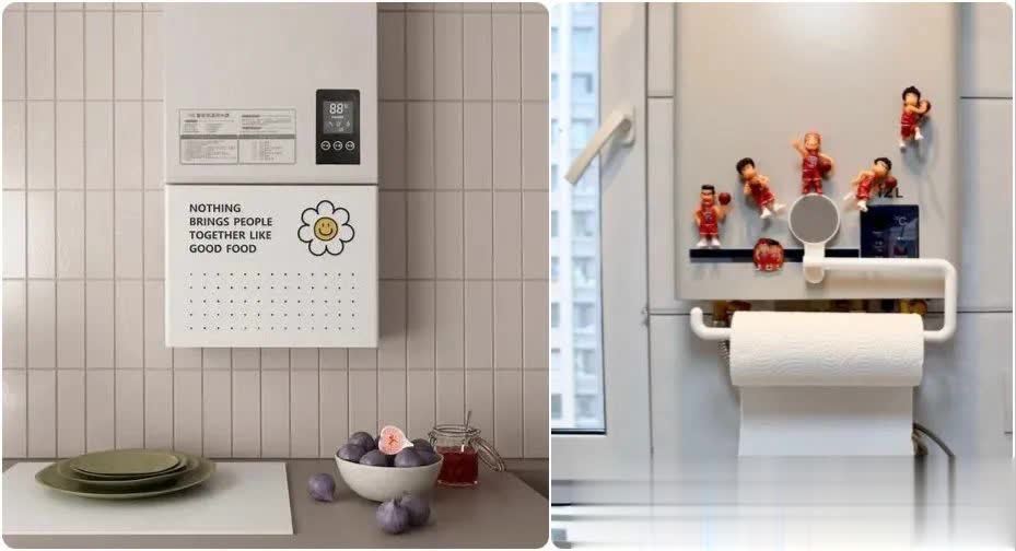 ▲固然开水器不笼罩,也可遮挡下方出丑的管说念和阀门,一种是洞洞板遮挡盒子,可加挂件挂唾手物品;另一种如右图纸巾架,能遮挡遮挡,取纸巾便捷。