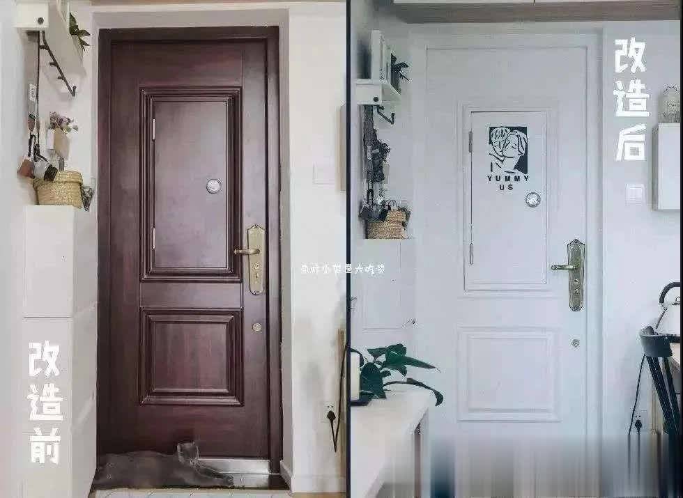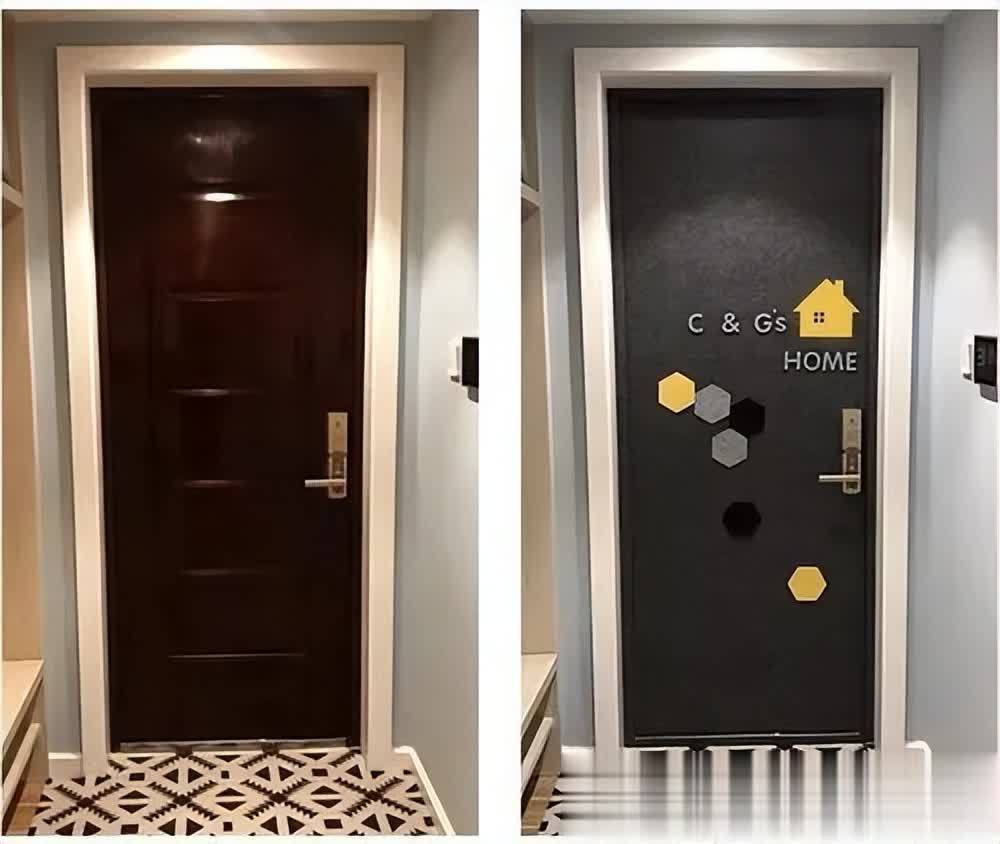 ▲如果嫌毛毡功能性不及,也可用磁性黑板贴,这样防盗门能兼顾家里涂鸦墙的作用,当个留言板也可以,还改造了出丑的猪肝色。
