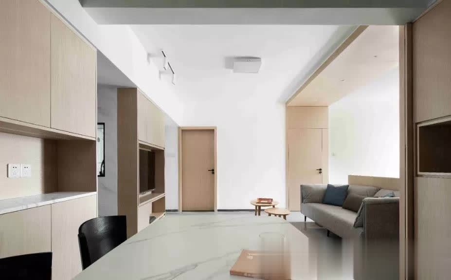 ▲精雅的水泥瓷砖与原木色搭配,营造出干净温馨的氛围。门厅与餐厅连系,欺诈右手空间打造顶天赶快的鞋柜,为幸免视觉压抑,四周吊顶必不能少。进门左手打造同色餐边柜,四东说念主位餐桌布局,基本知足功能需求。